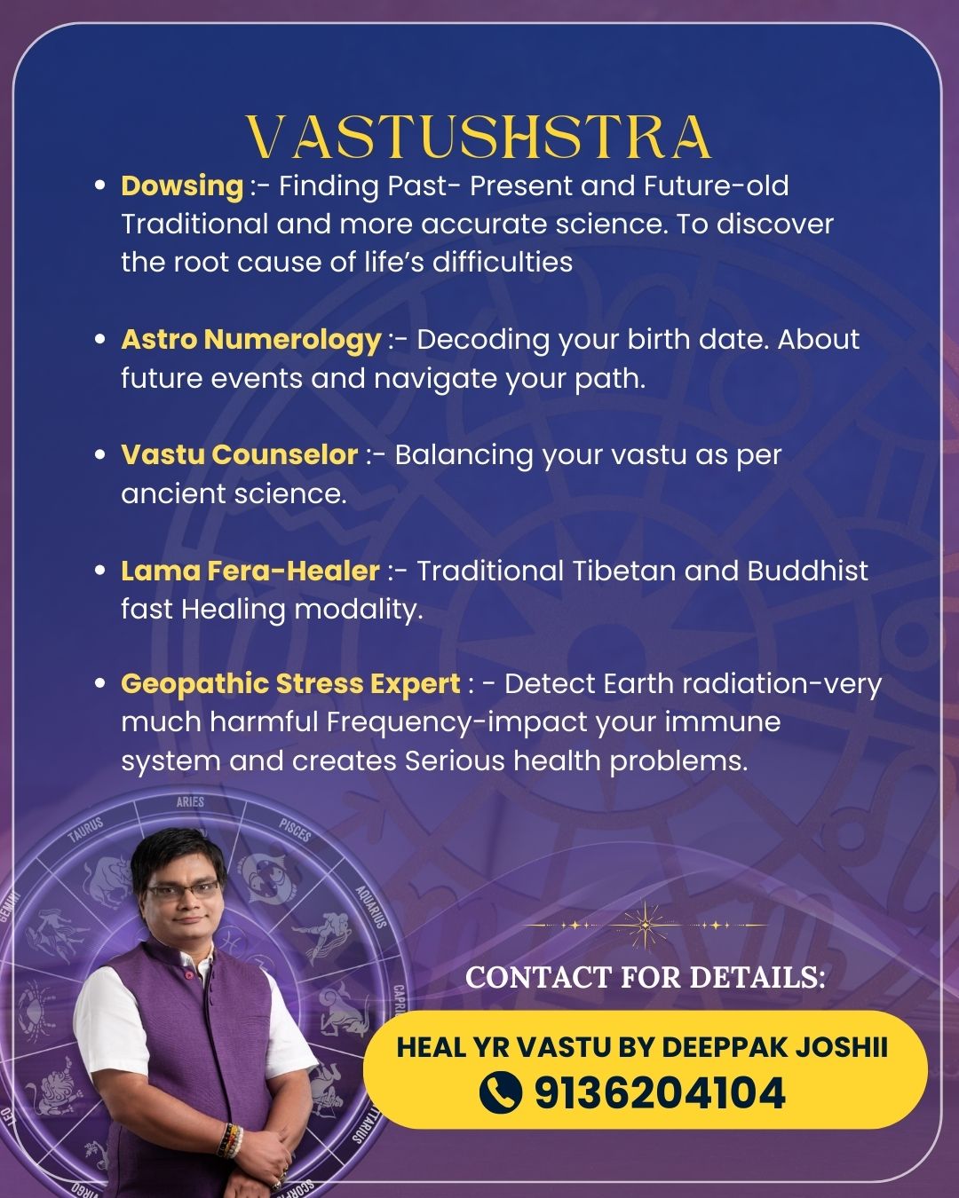 With experience since 2009, I specialize in creating positive and harmonious spaces through the integrated sciences of Vastu Shastra, Geopathic Stress Correction, Energy Dowsing, and Astro-Numerology.